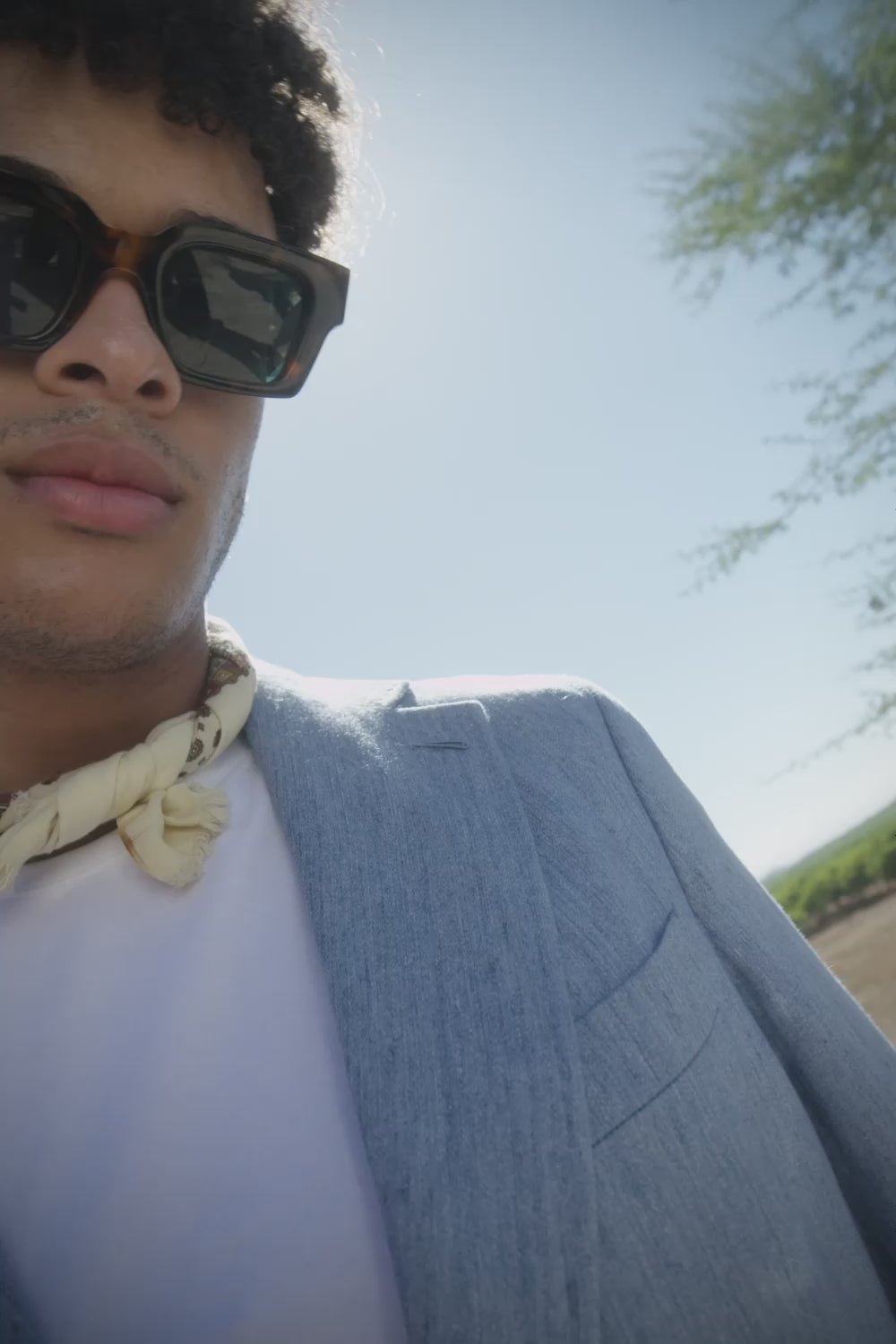 Der elegante Anzug wie vom Massschneider. In dieser Ausführung als klassischer Einreiher mit breitem Revers, Umschlag am Hosenbein, aufgesetzten Patch-Taschen und einem sommerlich leichten Linen-Fabric im hellblauen Denimlook.