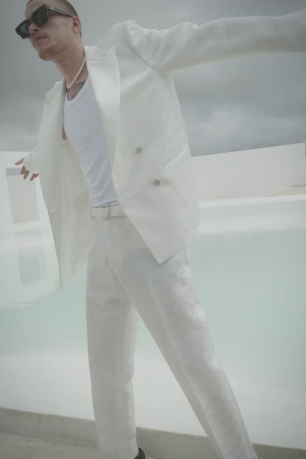 Der extra weit geschnittene Anzug. In dieser Ausführung als super klassischer Doppelreiher-Smoking, Handsaum am Hosenbein und einem weissen Paisley-Fabric, der dir den Atem raubt.